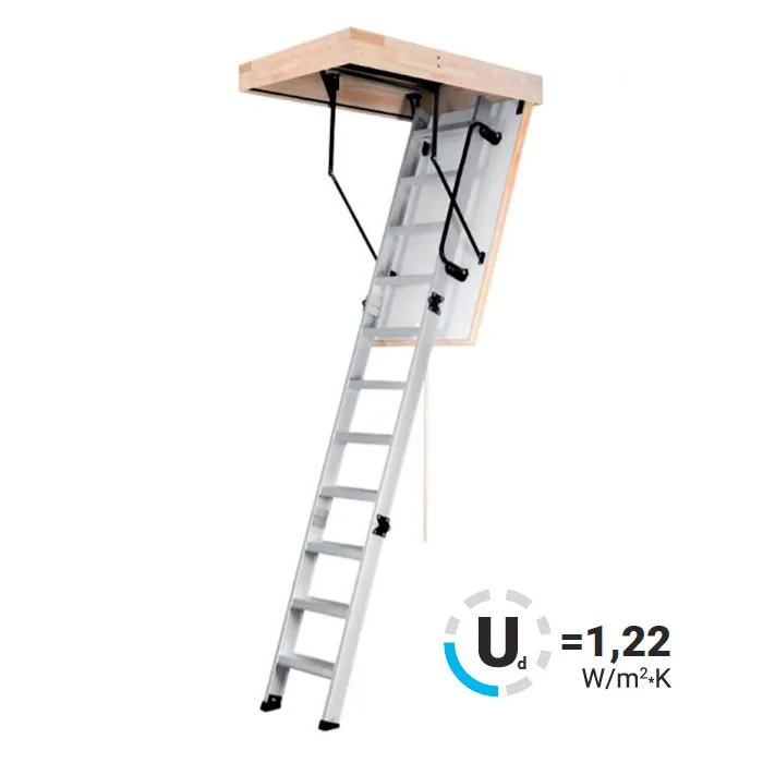 Металлическая чердачная лестница LST оснащена энергосберегающей термоизоляционной крышкой люка белого цвета. По периметру люка установлен контур уплотнения, обеспечивающий высокую степень герметичности. Благодаря «ножничной» системе складывания в сложенном виде лестница очень компактна и имеет небольшой размер крышки люка. S-образные боковые элементы лестницы выполняют роль поручней и придают лестнице современный вид.