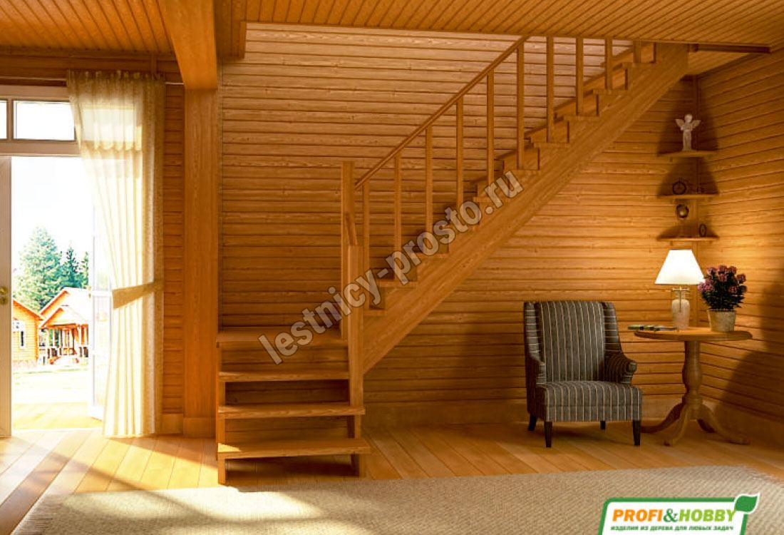 Ступени и поручень лестницы изготовлены из ясеня, остальные элементы из сосны.