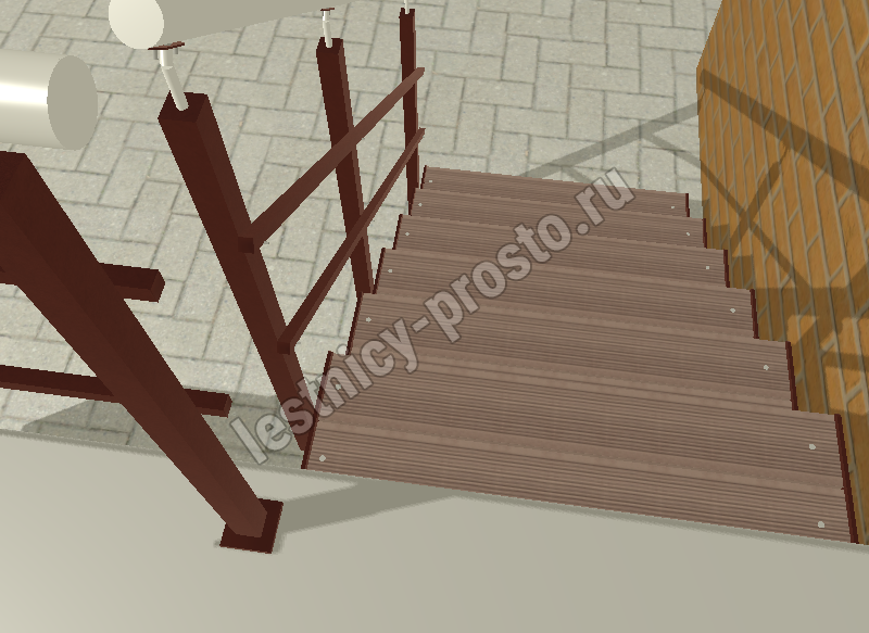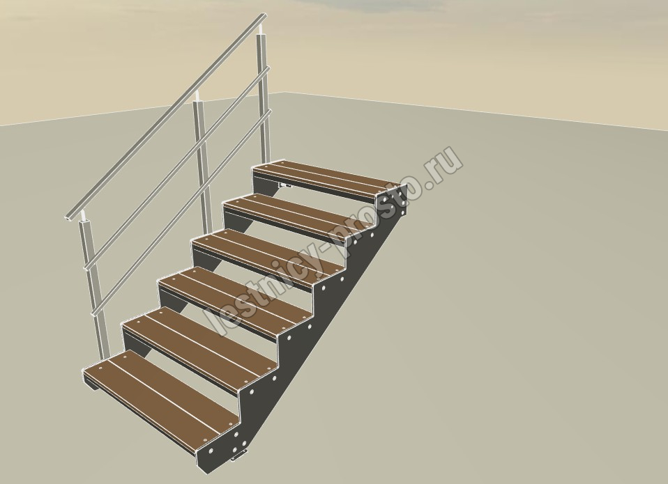 Ограждение типовой лестницы крашеное или из полированной нержавеющей стали. Базовый материал ступеней: террасная доска