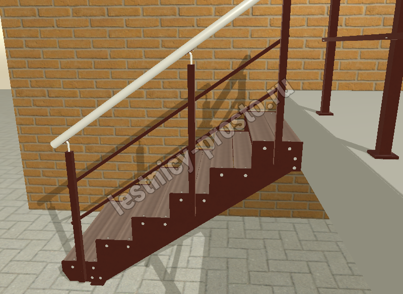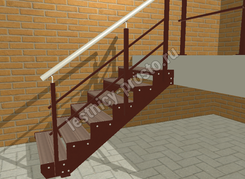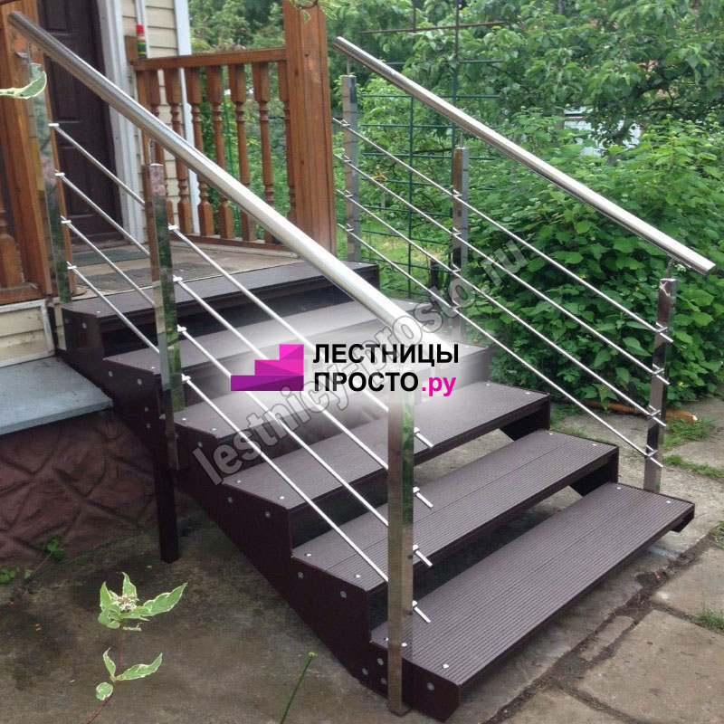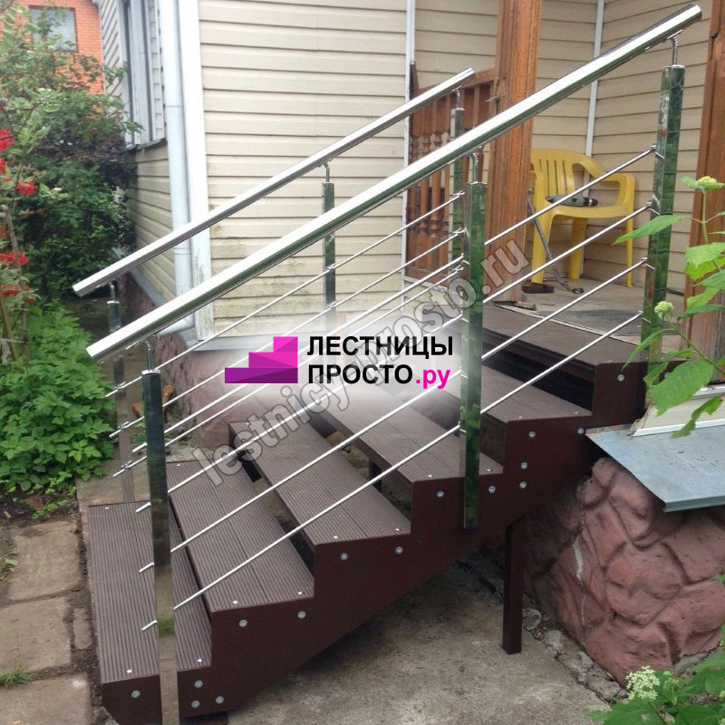 Покрытие порошковое, очень прочное и долговечное. Все детали каркаса крепятся с помощью болтов, благодаря чему Вы можете собрать каркас самостоятельно без применения сварки. В зависимости от ширины лестницы, каркас состоит из двух (ширина до 1 метра) или трех (ширина до 2 метров) опорных балок (тетив). Ступени лестницы состоят из металлической рамки, обеспечивающей необходимую прочность, и покрытия из террасной доски ДПК (древесно-полимерный композит). Ступени не боятся воды и мороза, не теряют со временем свой внешний вид и не требуют ухода. Нержавеющая сталь, которую мы используем для ограждений на улице - неприхотлива в обслуживании, выглядит стильно и прекрасно выдерживает капризы погоды