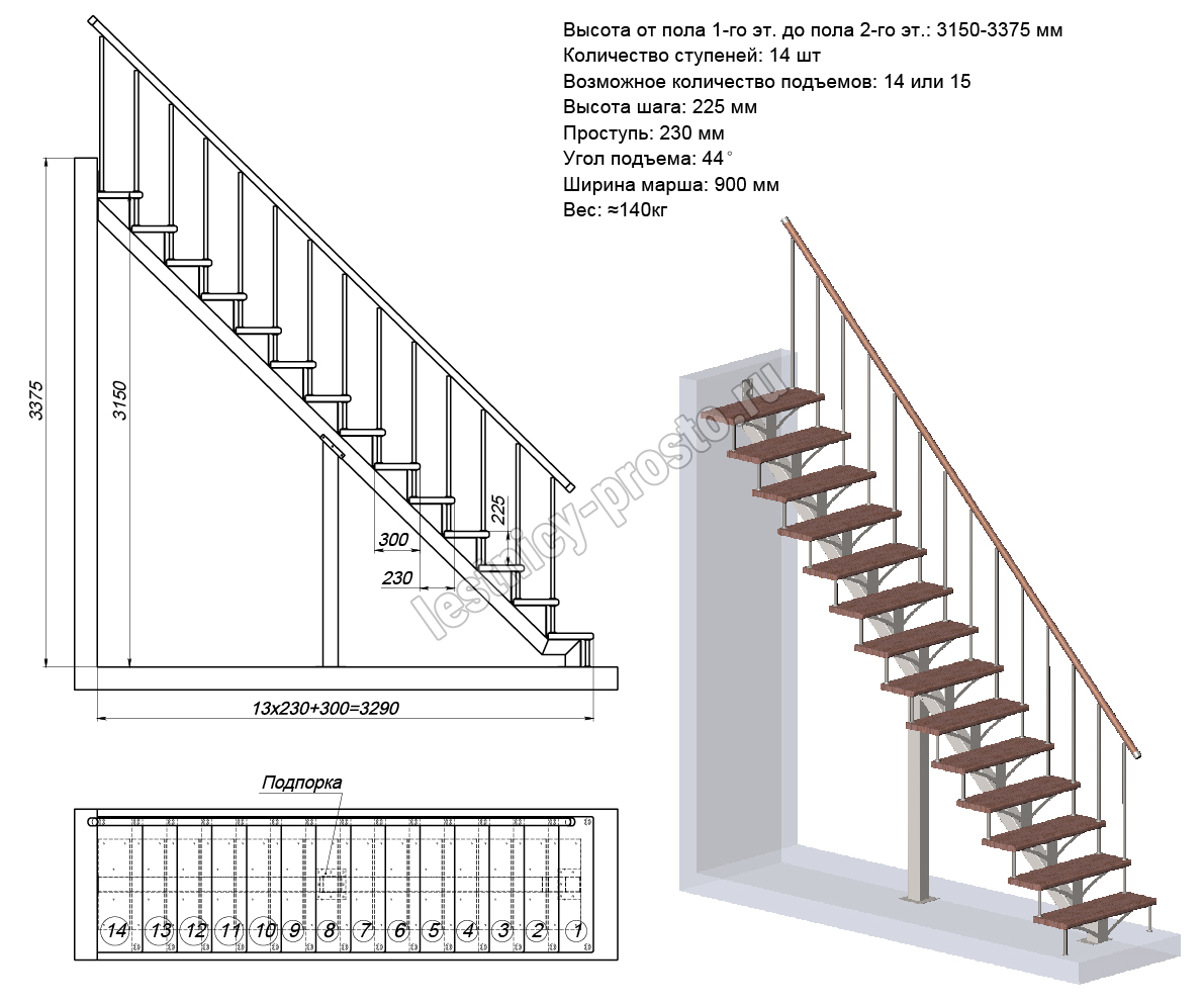 Лестница PROSTO MONO прямая, h337.5 см, ступени хвоя