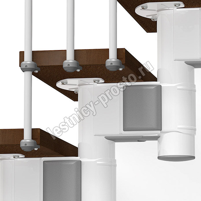 При монтаже этой лестницы, возможно регулировать высоту и глубину шага, таким образом можно получить лестницу под высоты этажа в диапазоне 2250 - 3030 мм, кроме того, установив дополнительный комплект увеличения высоты, можно поднять высоту лестницы до 3730 мм. Ширина проступи регулируется при монтаже в пределах 180 - 220 мм. Каркас и стойки ограждения выполнены из пластифицированного металла. Уникальный модульный каркас позволяет собрать лестницу необходимой формы.