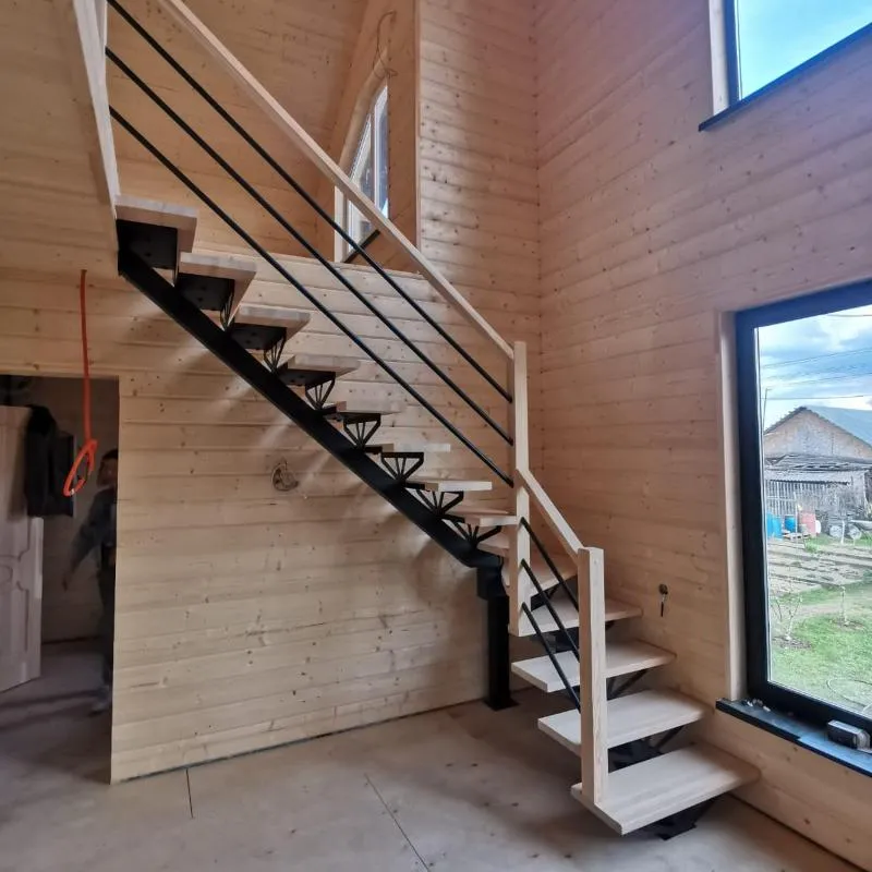 соответствует картинке, но вы не ограничены в его выборе. Лестницу можно приобрести и без ограждения, и с любым другим. Устанавливать на такую лестницу можно почти всё, начиная от классических деревянных балясин и заканчивая эксклюзивными коваными изделиями.