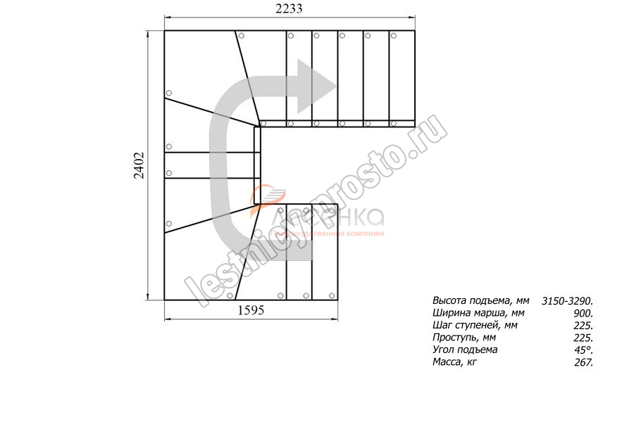 Модульная лестница Спринт 225 3150-3290, Серый, Сосна, Крашеная, Без Ступений