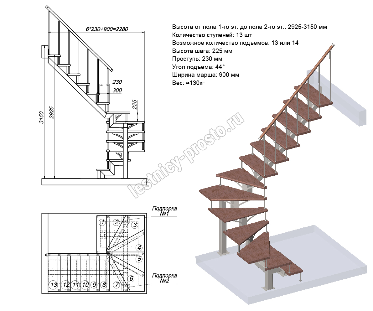 Лестница PROSTO MONO П-образная, h315 см, ступени хвоя |
