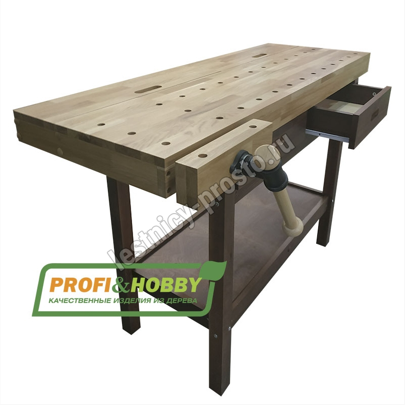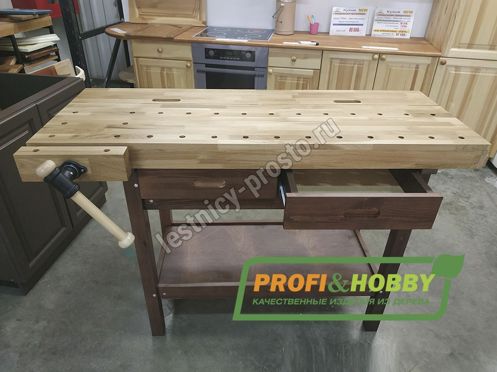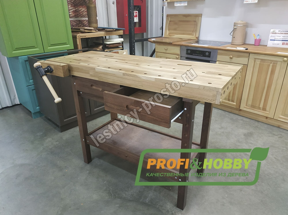 Комплектация: 1 тиски, 2 пенала в столешнице, 2 выдвижных ящика, полка для инструментов.
