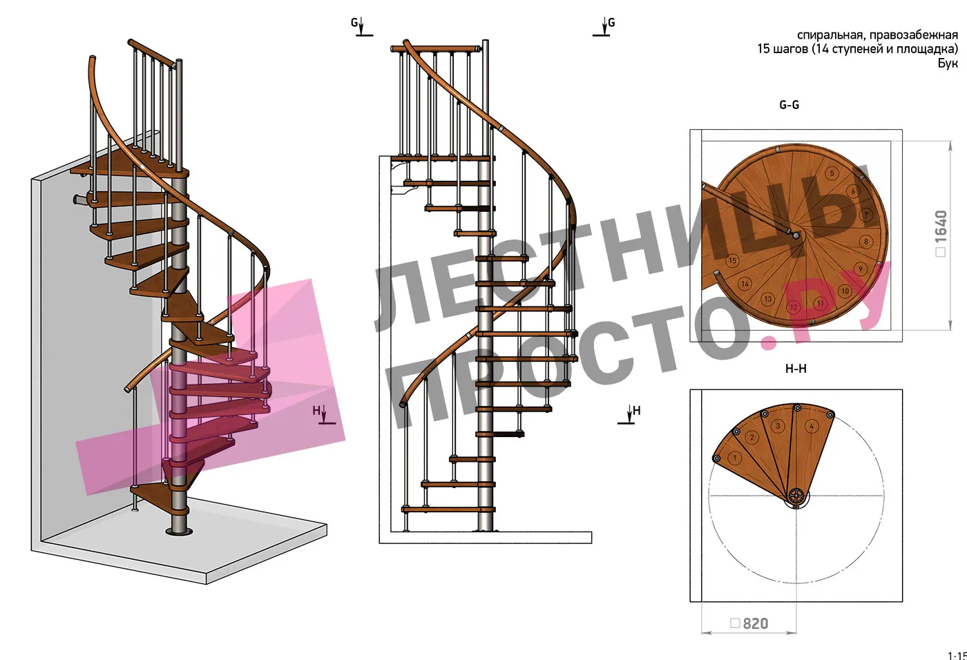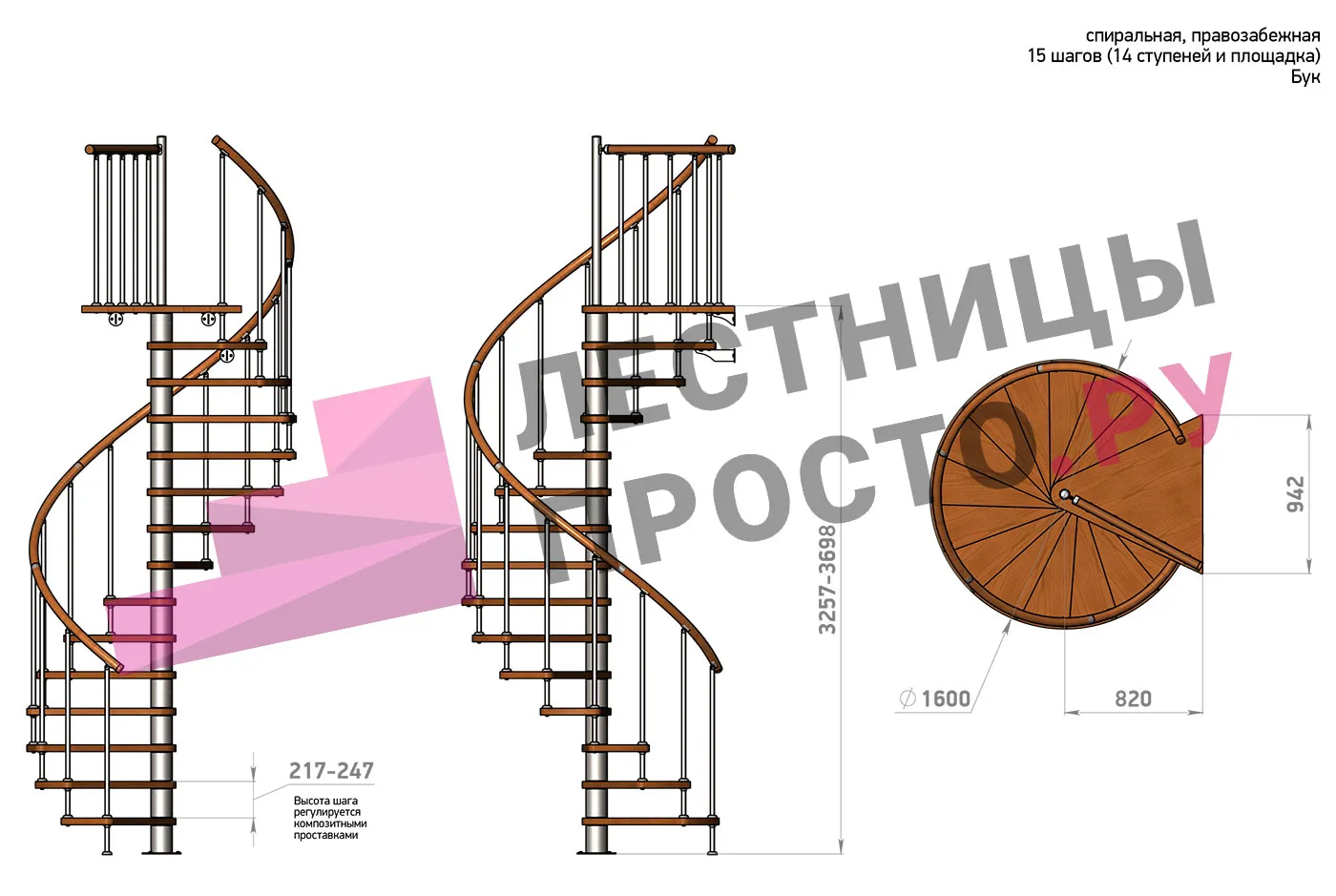 Правая, d=120см, 14 ступеней + площадка