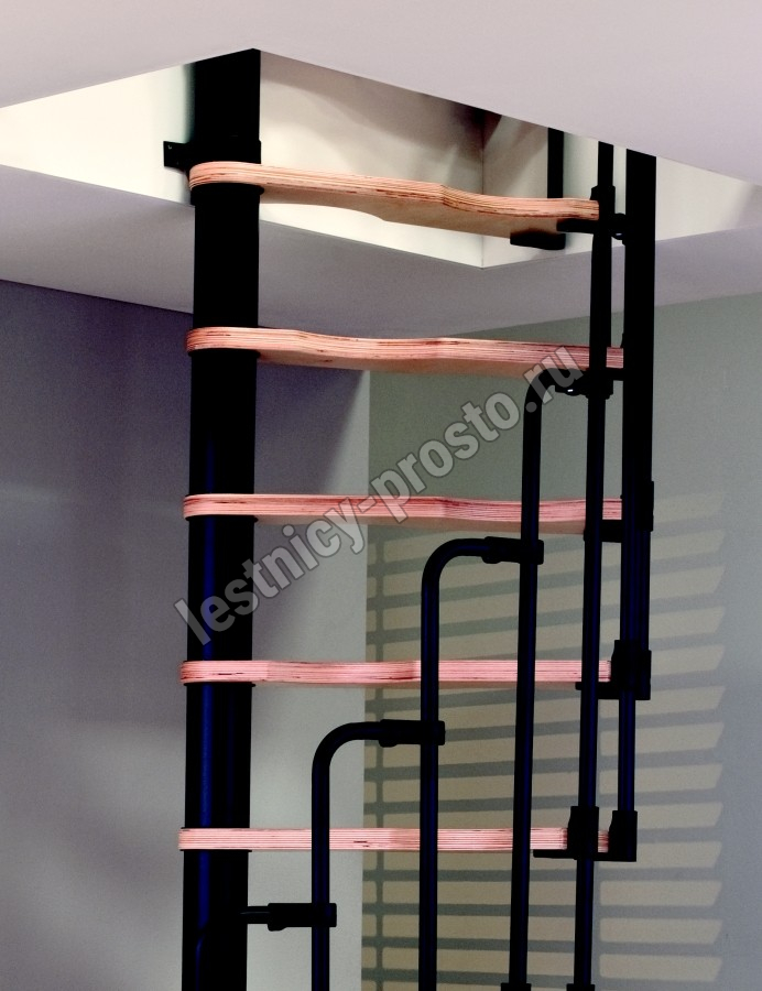 Компактная надёжная лестница. Ступени толщиной 30 мм, изготовлены из массива берёзы по технологии Multiplex, лакированные. Все металлические части оцинкованы, горячим способом и покрыты порошковой краской - черного цвета; Лестница имеет надёжную несущую стальную конструкцию.
